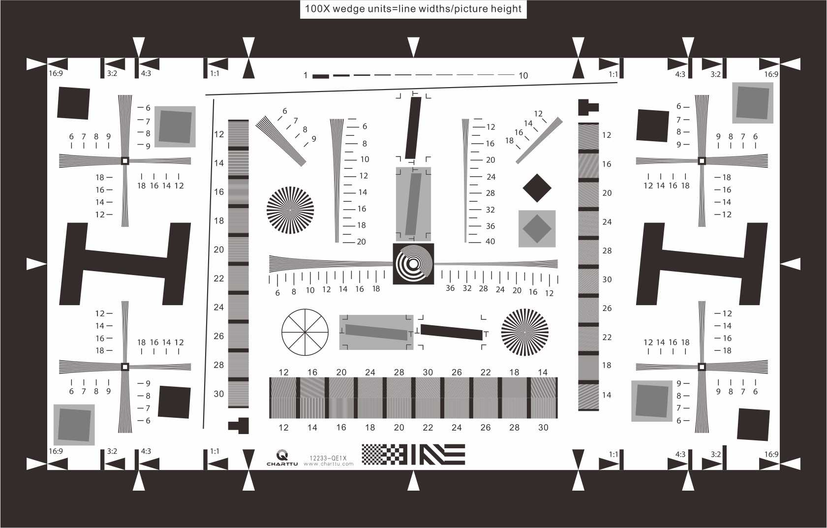 型號(hào):12233-QE介紹:ISO12233標(biāo)準(zhǔn)適用于民用靜止照片數(shù)碼相機(jī)以下簡(jiǎn)稱(chēng)(DSC),用于手機(jī),監(jiān)控?cái)z像機(jī),機(jī)器視覺(jué)等圖像、視頻采集設(shè)備的清晰度分析。ISO12233增強(qiáng)型分辨率測(cè)試卡,除了具有標(biāo)準(zhǔn)版的所有的特點(diǎn)外,還加上了一些新特點(diǎn),如:星狀圖,4:1對(duì)比度5°斜邊等。ISO12233分辨率最高支持4000線。可以測(cè)試水平與垂直方向分辨率率。該Chart圖包含了SFR測(cè)試、MTF測(cè)試(頻