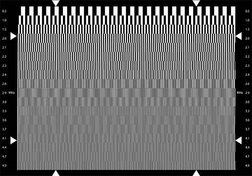 TE144-Q用于評估消費者攝像機的頻率響應(yīng)。測試圖被細分為18個不同頻率的條形圖水平場。