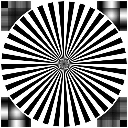 TE133-Q中心一個36周期的西門子星圖,邊緣設(shè)計了垂直和水平網(wǎng)格線,為0.78和1.56 LP/mm。測試網(wǎng)格可以對攝像機(jī)、鏡頭、縮微膠片系統(tǒng)和放大設(shè)備等光學(xué)系統(tǒng)的插圖質(zhì)量進(jìn)行評估。