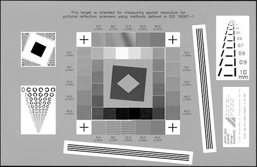 ISO-16067掃描分辨率Chart圖包括傾斜邊緣、字母數(shù)字分辨率圖、Landolt環(huán)圖和灰色步長貼片。水平,垂直和傾斜羅奇模式提供6至40周期每毫米。應(yīng)用圖像還提供了一個T-100數(shù)字電子像素目標(biāo)(如標(biāo)準(zhǔn)第4.1.2節(jié)所允許的),該目標(biāo)具有寬為0.1至1.0毫米(寬長比為1:5)的水平、垂直和傾斜條。特性類型反射大小152毫米x 100毫米