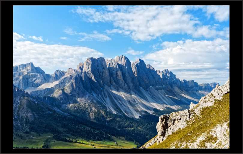 藍天白云,明暗既分明細節(jié)過度又豐富的層疊山峰,由淺入深的綠草地與樹林。可以觀察藍天白云的白平衡,觀察山峰草地樹林的紋理細節(jié)及動態(tài)范圍情況。