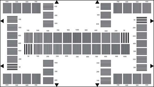 HDTV分辨率Chart圖(1000線對)用來衡量和描述成像系統(tǒng)的頻率響應(yīng)。Chart圖分布著50個光柵組,光柵組被布置在水平和垂直方向上,以測量在兩個方向上的分辨率。所有光柵組都用數(shù)字標(biāo)出LP/PH分辨率。中間兩排的排列方式不同,上面一排最高的分辨率在圖片的中間,頻率1000LP/PH的在中間,兩側(cè)減少。在下面一排頻率從左邊的50LP/PH增加到右邊的1000LP/PH,可以用來測量和描述檢查的