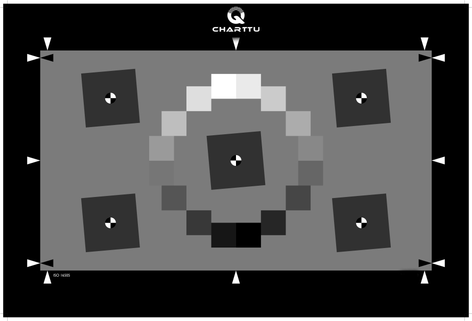 Chart圖布局包括五個(gè)傾斜邊SFR方塊,每個(gè)SFR方塊包含兩個(gè)測量水平分辨率邊與兩個(gè)測量垂直分辨率邊。它還包括一組環(huán)形灰階。